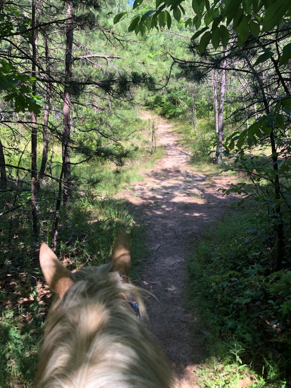 There was one point during an uphill climb that the trail passed over some boulders. I dismounted and climbed over using my hands and feet and Simon climbed along behind me playing the part of a billy goat. I wish I could have gotten a photo or better yet, a video of him navigating this section but my hands were way too busy. I would not consider this portion of the trail equine friendly at all and I did not see anyway to work around it. The Boulder section was probably a good 60 feet long to navigate.