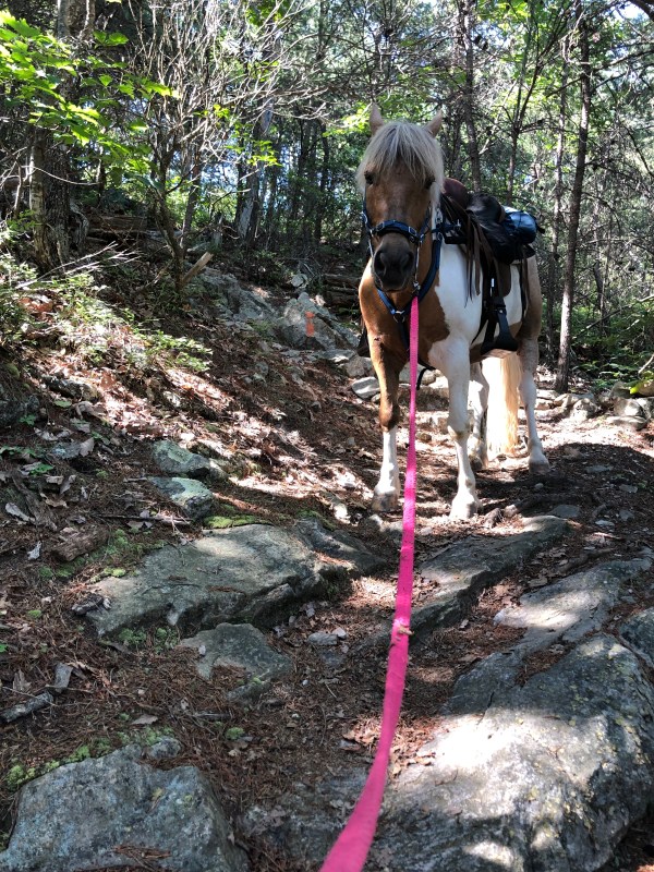 This loveliness ends abruptly in a steep down hill climb. I dismounted here, and wishing I had on my riding sneakers vs my smooth bottomed riding boots, I clambered down the mountain, using tree branches to help me down. Meanwhile Simon bill-goated along behind me, munching on leaves.