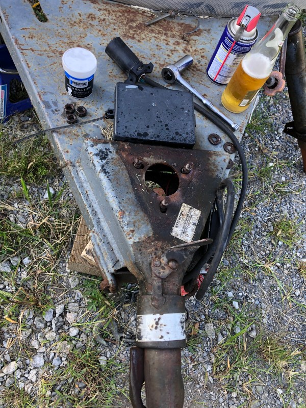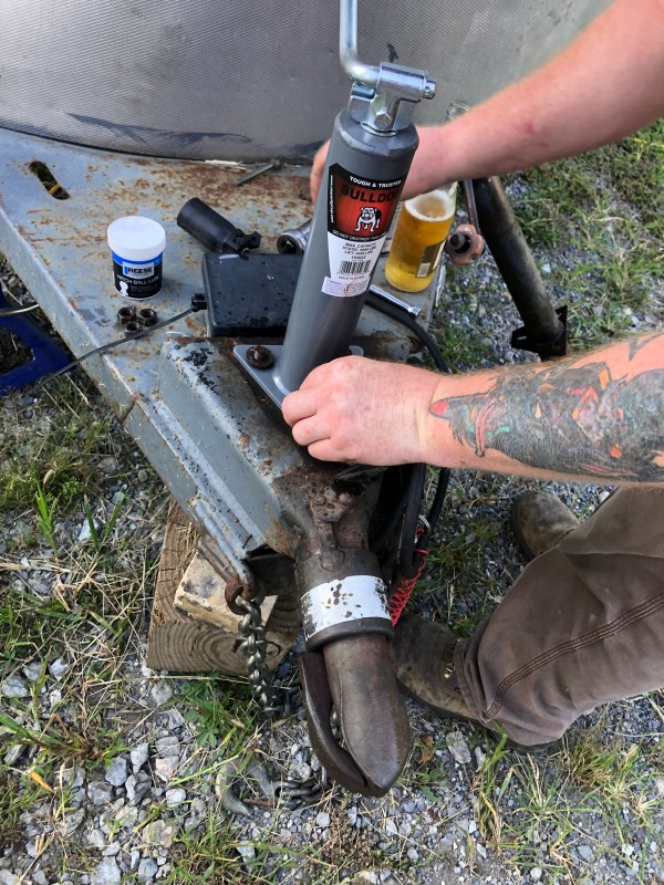 First we sprayed DW40 on the three nuts. Then we wound the trailer up and put the two jack stands under the hitch bars, one on either side. Then we wound the original jack down, putting the weight on the jack stands and none on the actual trailer jack. Next my husband used the ratchet wrench to loosen and then remove the three bolts. This was the hard part and took a bit of arm strength.