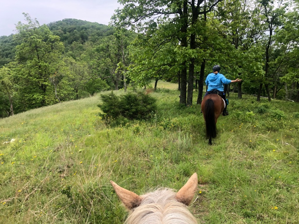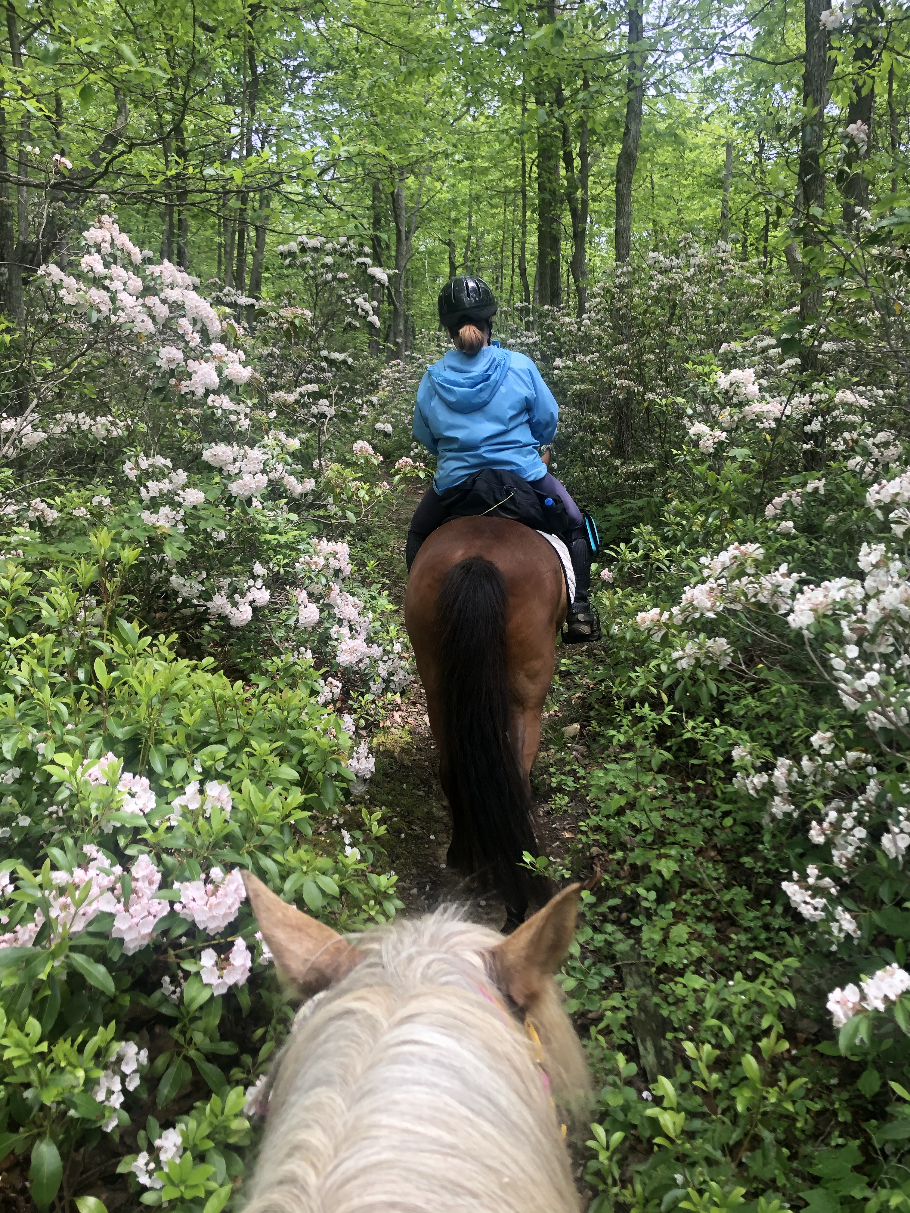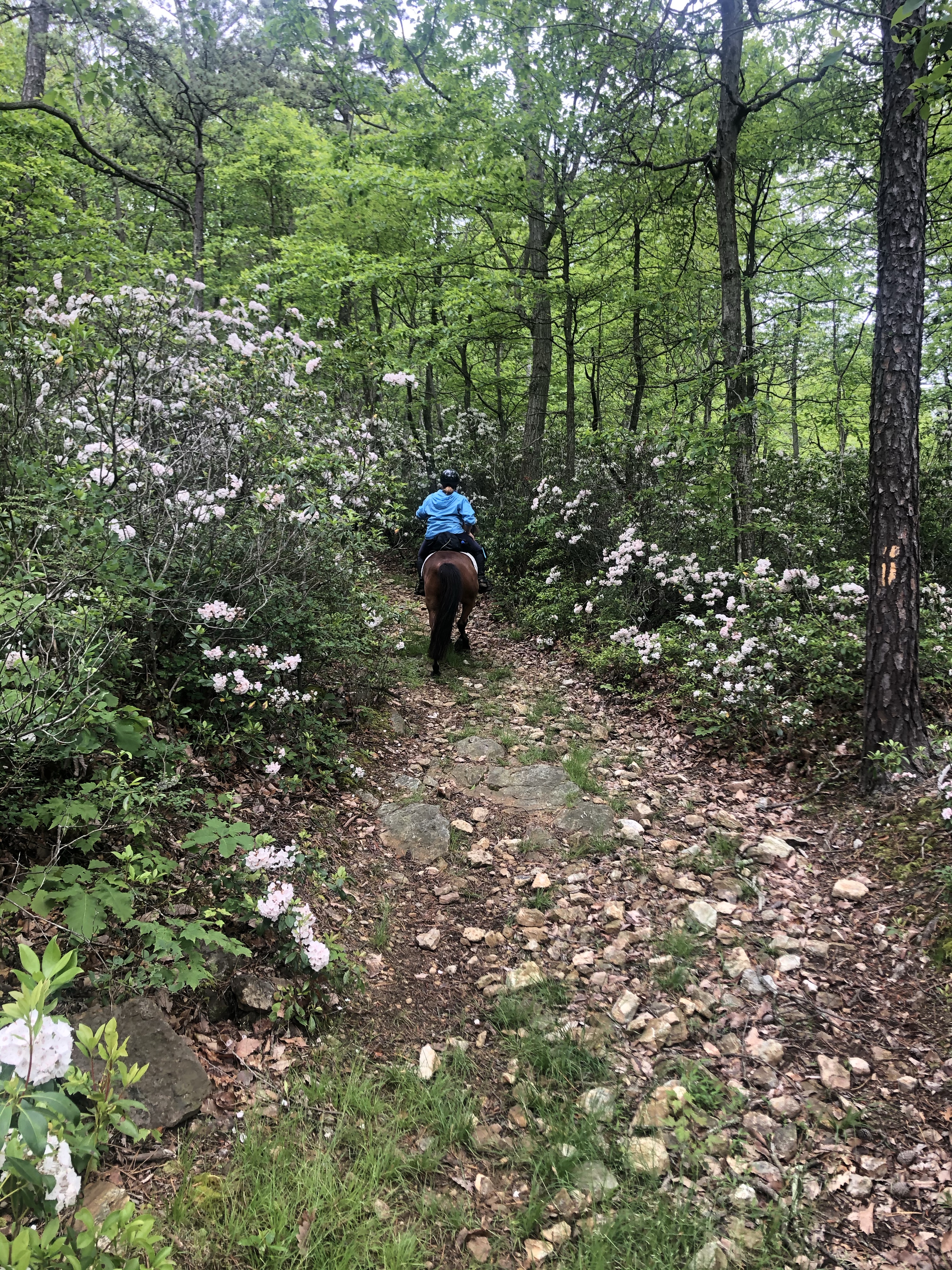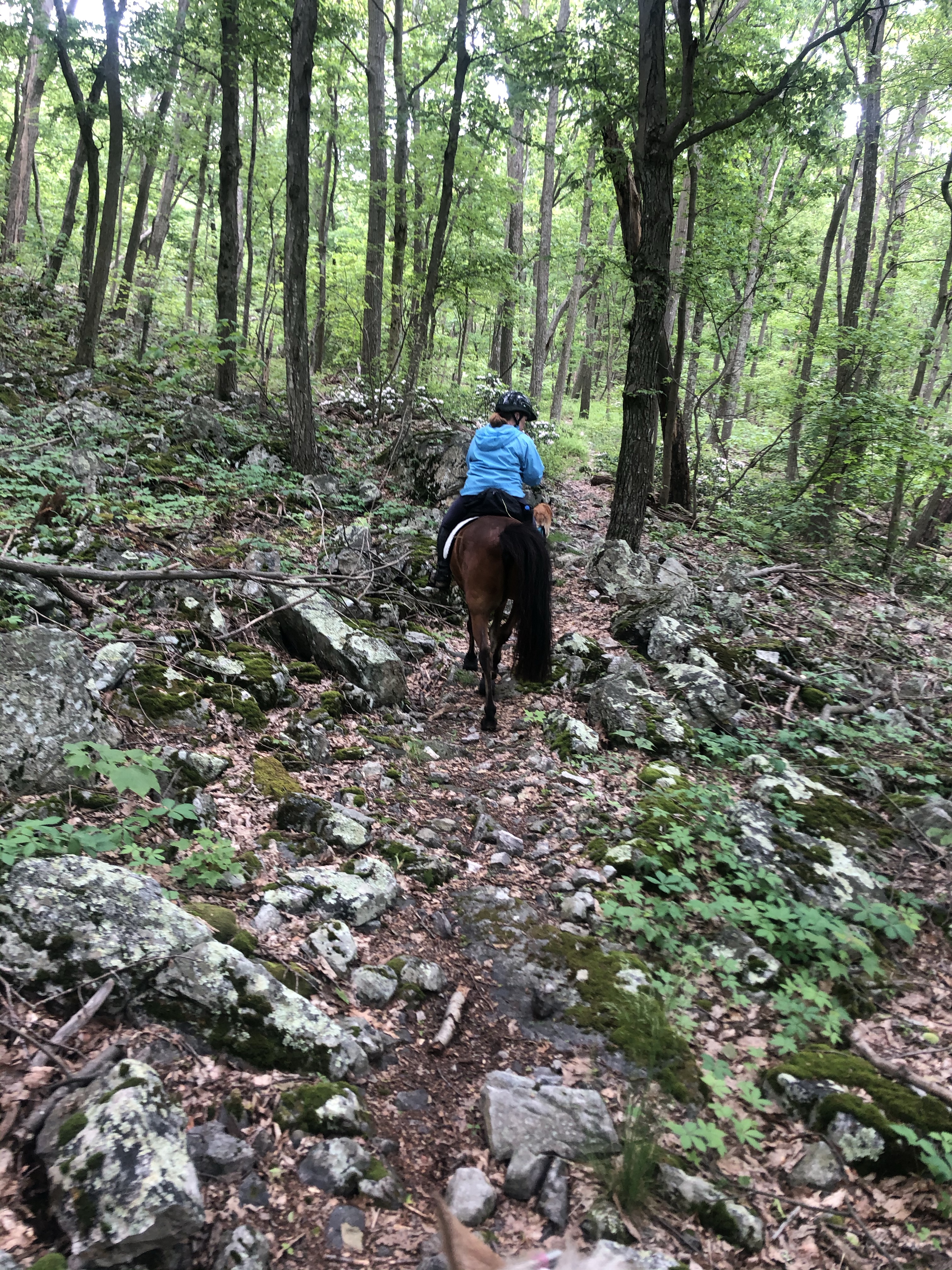 North Mountain Trail was also gorgeous and boasted lots of amazing overlook views. But it did start out very bouldery. Not rocky, but boulders to navigate through. It was also covered in lush green grass so the boulders were somewhat hidden. This was a lot of work for the ponies to navigate. I spent this whole several mile section constantly yanking Simon’s head up, every, stride. I repeat, every stride.