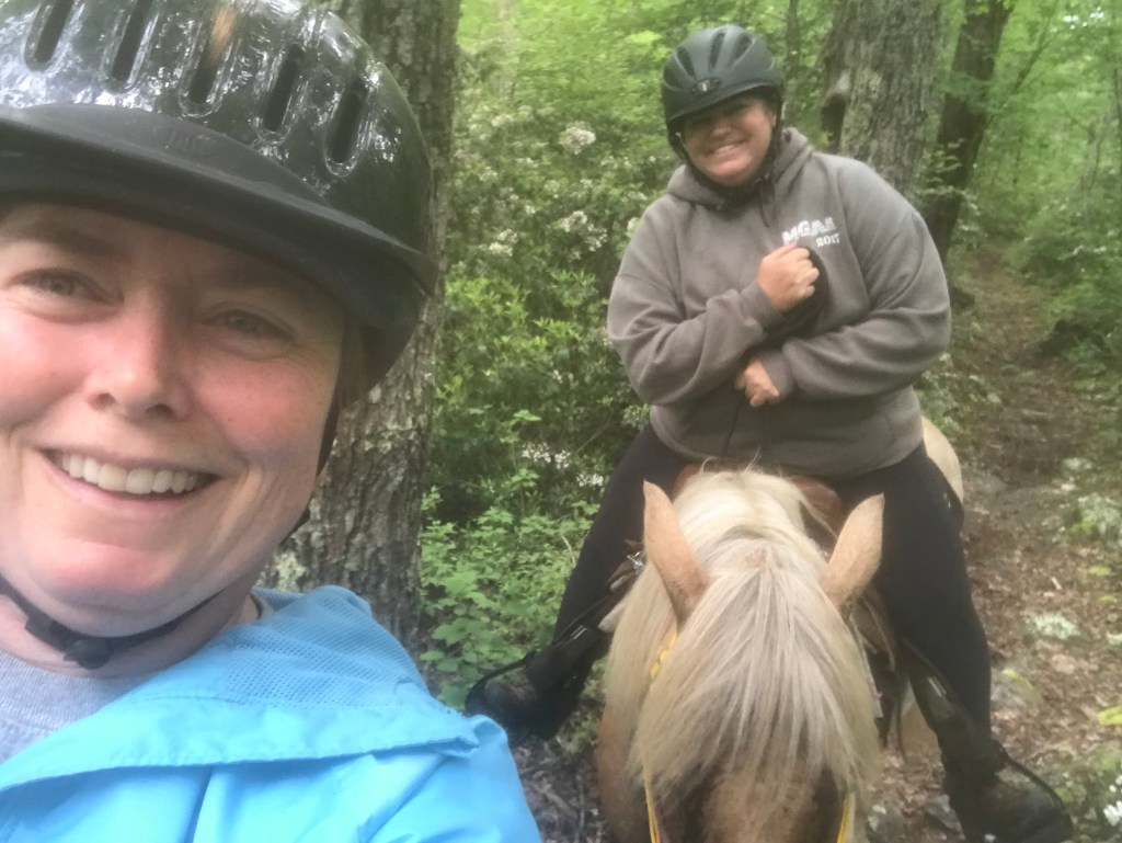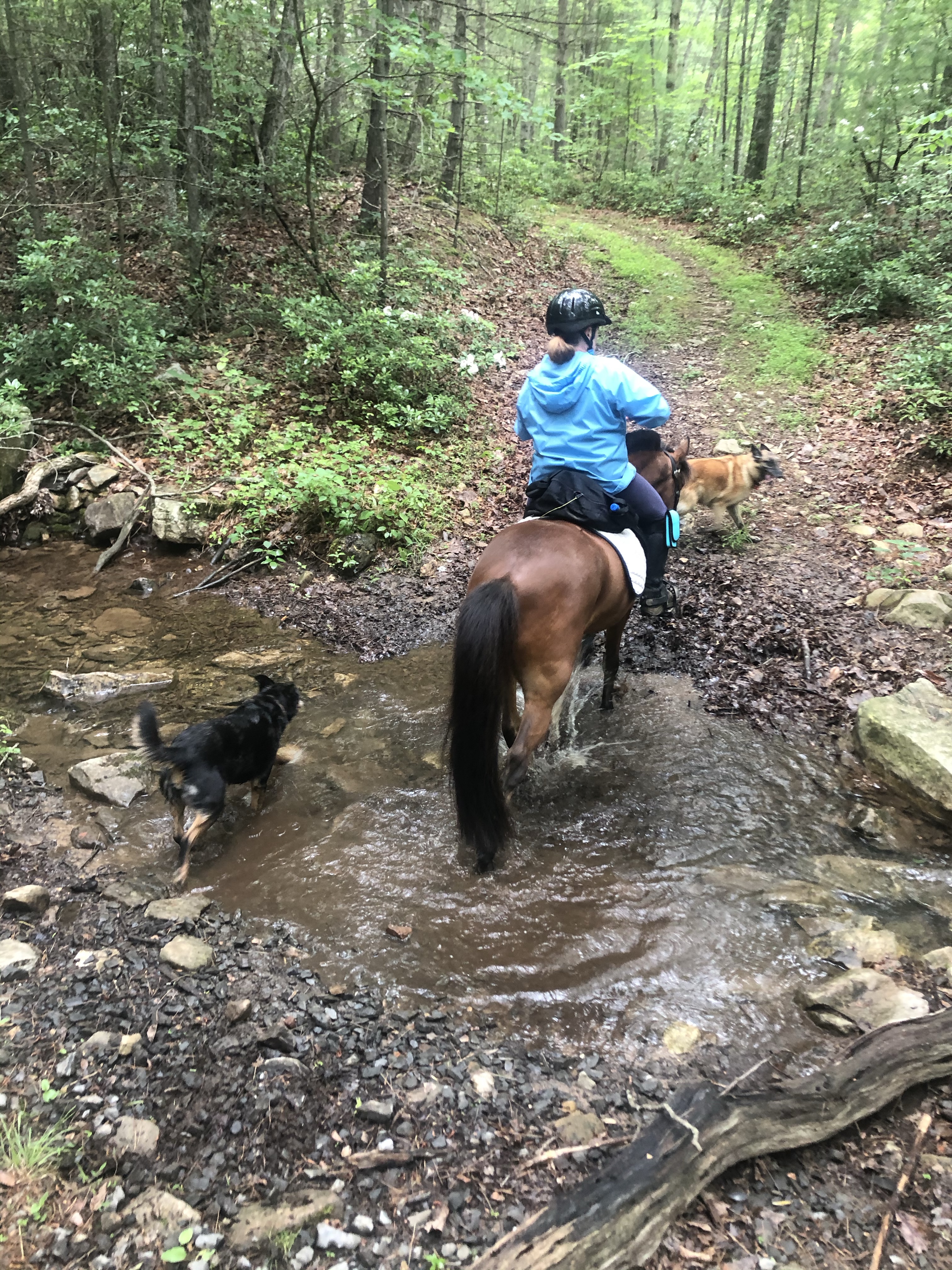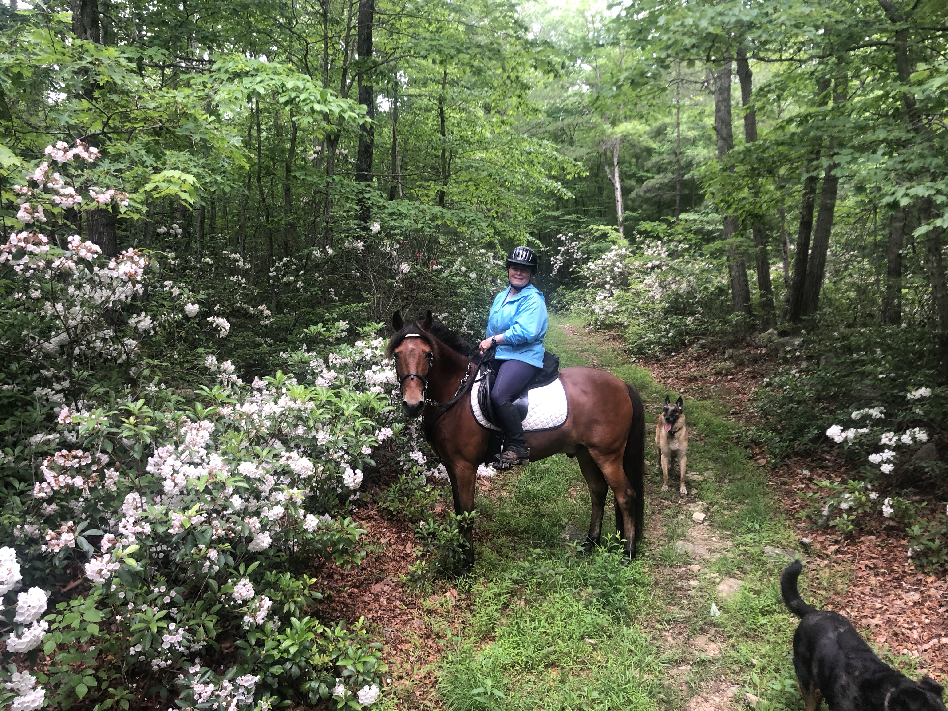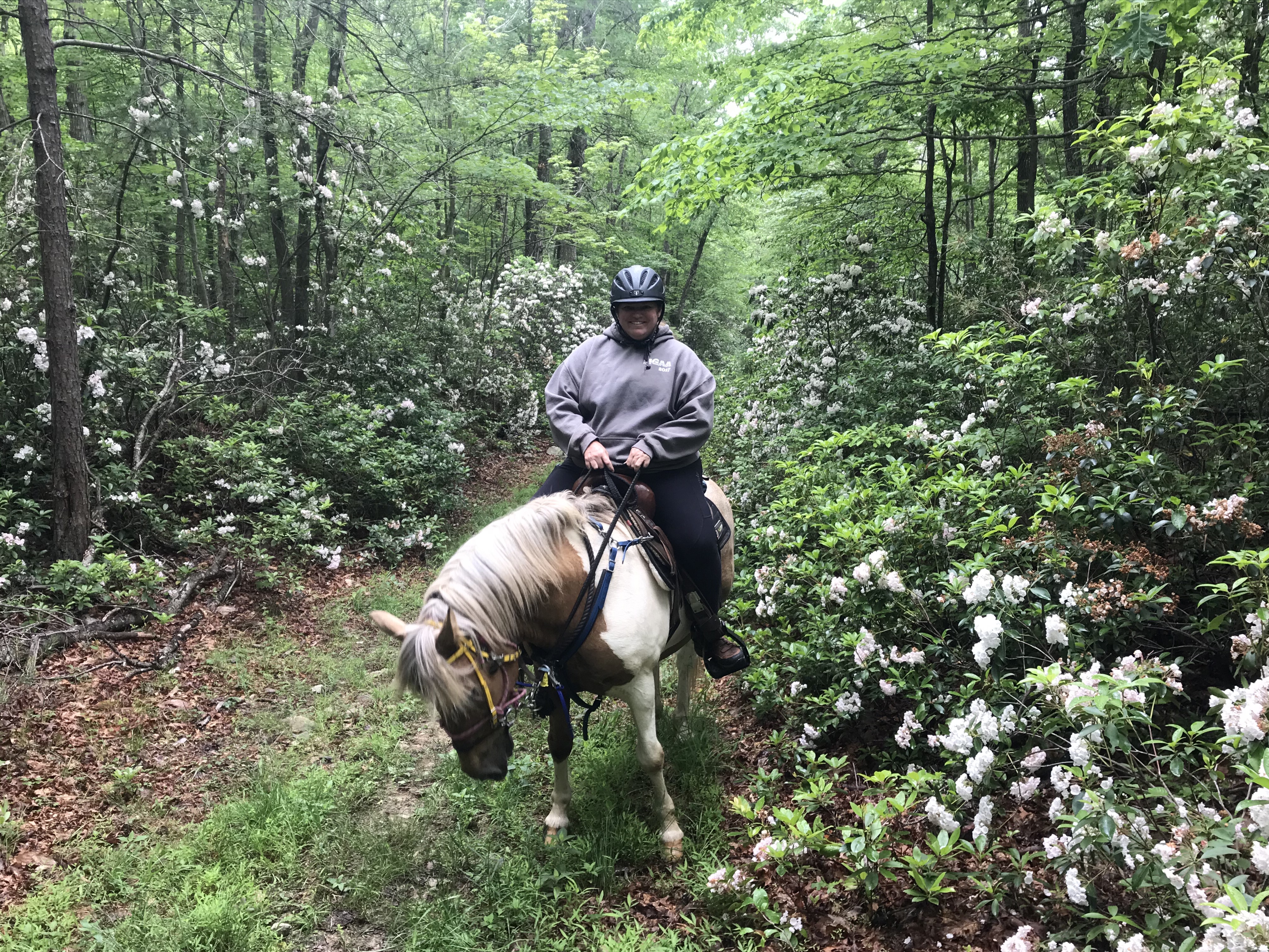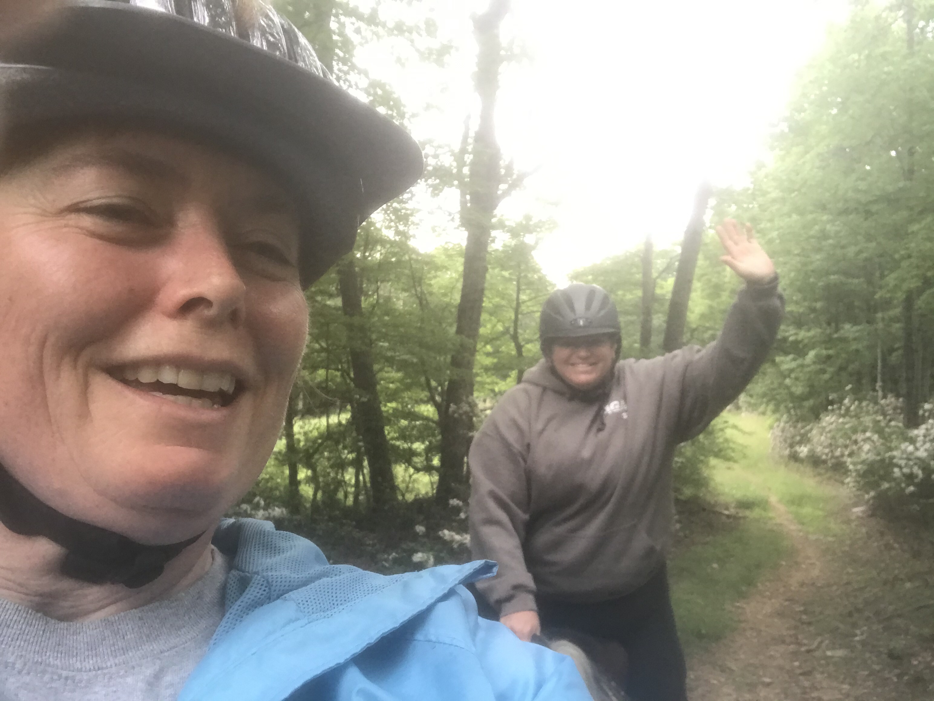 North Mountain Trail was also gorgeous and boasted lots of amazing overlook views. But it did start out very bouldery. Not rocky, but boulders to navigate through. It was also covered in lush green grass so the boulders were somewhat hidden. This was a lot of work for the ponies to navigate. I spent this whole several mile section constantly yanking Simon’s head up, every, stride. I repeat, every stride.
