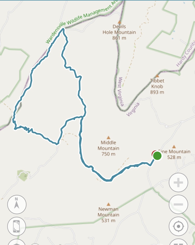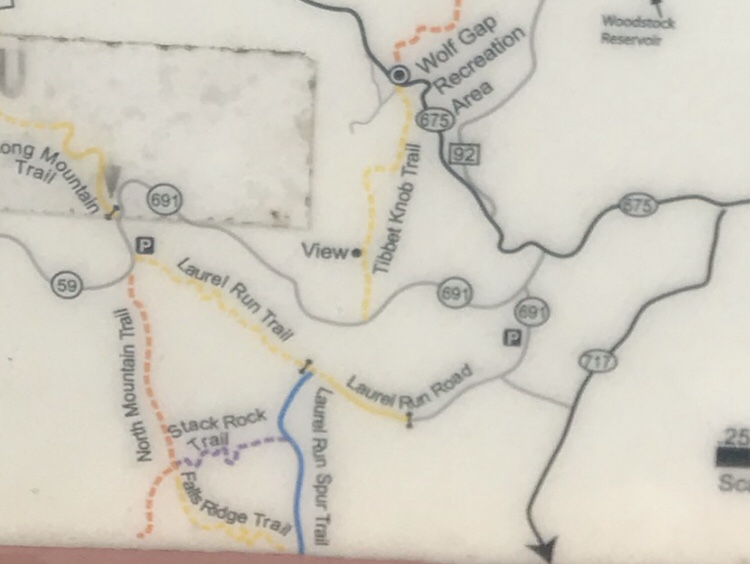 Using the map in the image below (this is the map that is posted frequently throughout the trail network) we parked at the P on 691 toward center right in the image. From the parking we rode down and then left onto Laurel Run Rd (yellow) to the next P. From there we made a hard left onto North Mountain Trail (orange). We followed this to Stack Rock Trail (purple), to a left on Laurel Run Spur (blue) and then right back onto Laurel Run Rd.