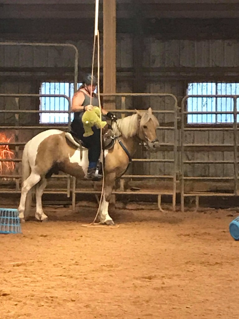 Obstacles included crossing over some flower boxes, crossing a bridge, walking over noodles, weaving through baskets, pushing a large ball, and using a pulley to retrieve a stuffed animal. Jenny and I started off, and thoroughly enjoyed the course. We than cheered on the other pair, Elizabeth and Anna. We took a second round of the course, speeding up our time, laughing the whole way. We both very much enjoyed this game and it played well for Jenny and I with our Mounted Games background.