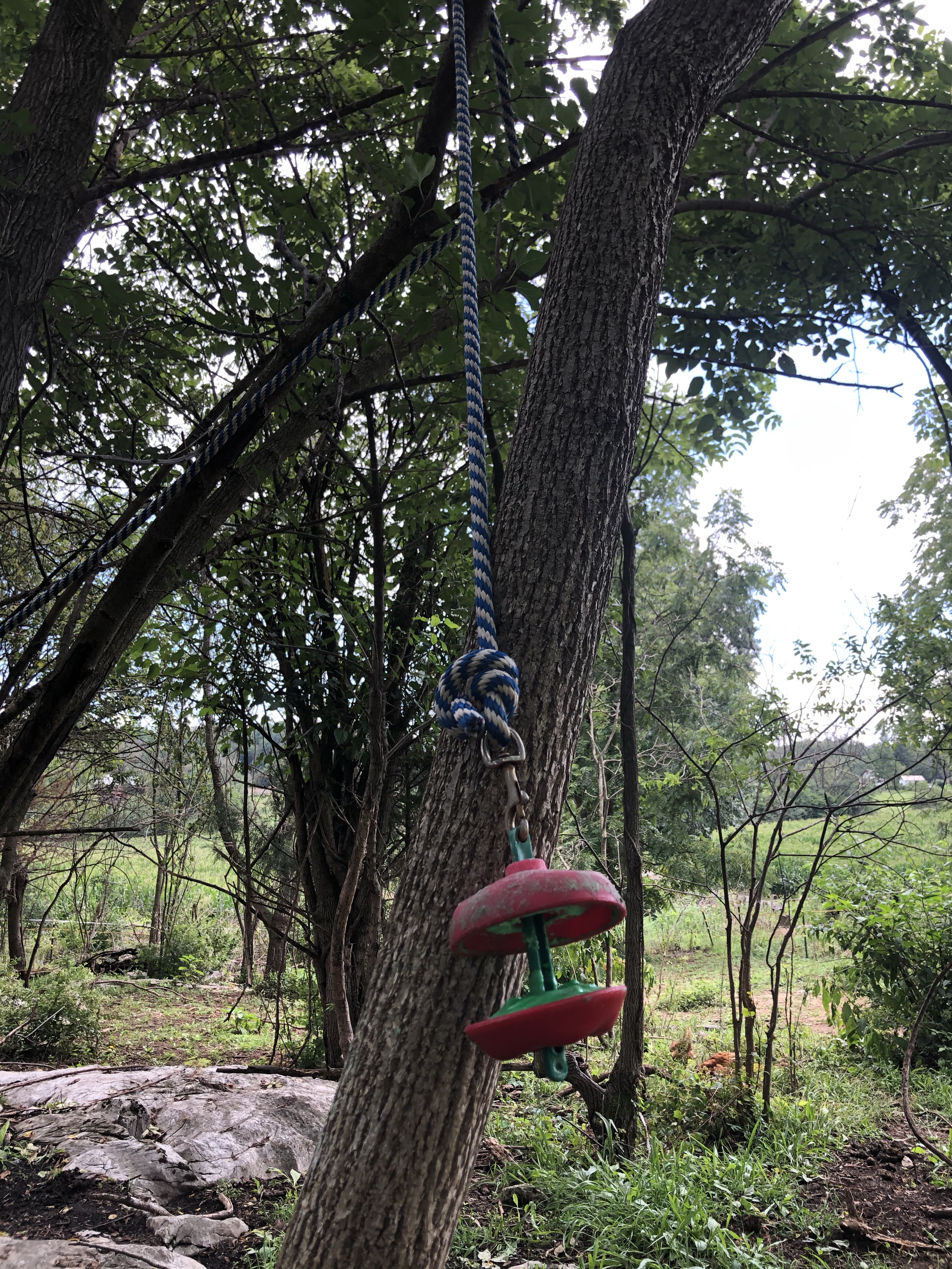 Today I took Simon out for a trail ride with Carol Ann. I put Neville in the woods paddock like I usually do when I leave him home alone. The paddock was prepped with two full hay barrels and a nearly new Lik-It hanging from a tree. I also left his halter on which is typical for when I leave him home alone.