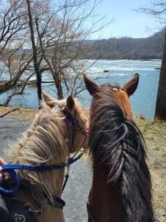 We parked near Lock 34 on the west end of Harpers Ferry, West Virginia, and rode to the Brunswick, Maryland parking area. We clocked just about 11 miles. There were busy areas where we were crowded in with hikers and bikers, and there were other areas that were wide open that we could let the ponies kick up their hooves and cover some ground. We stopped to let the ponies dip their toes in the river and get a drink while we enjoyed the scenery. Val and I both were thrilled to continuously point out all the turtles along the trail sitting on sticks, rocks, and logs in the over flow water. Who doesn’t love a turtle.