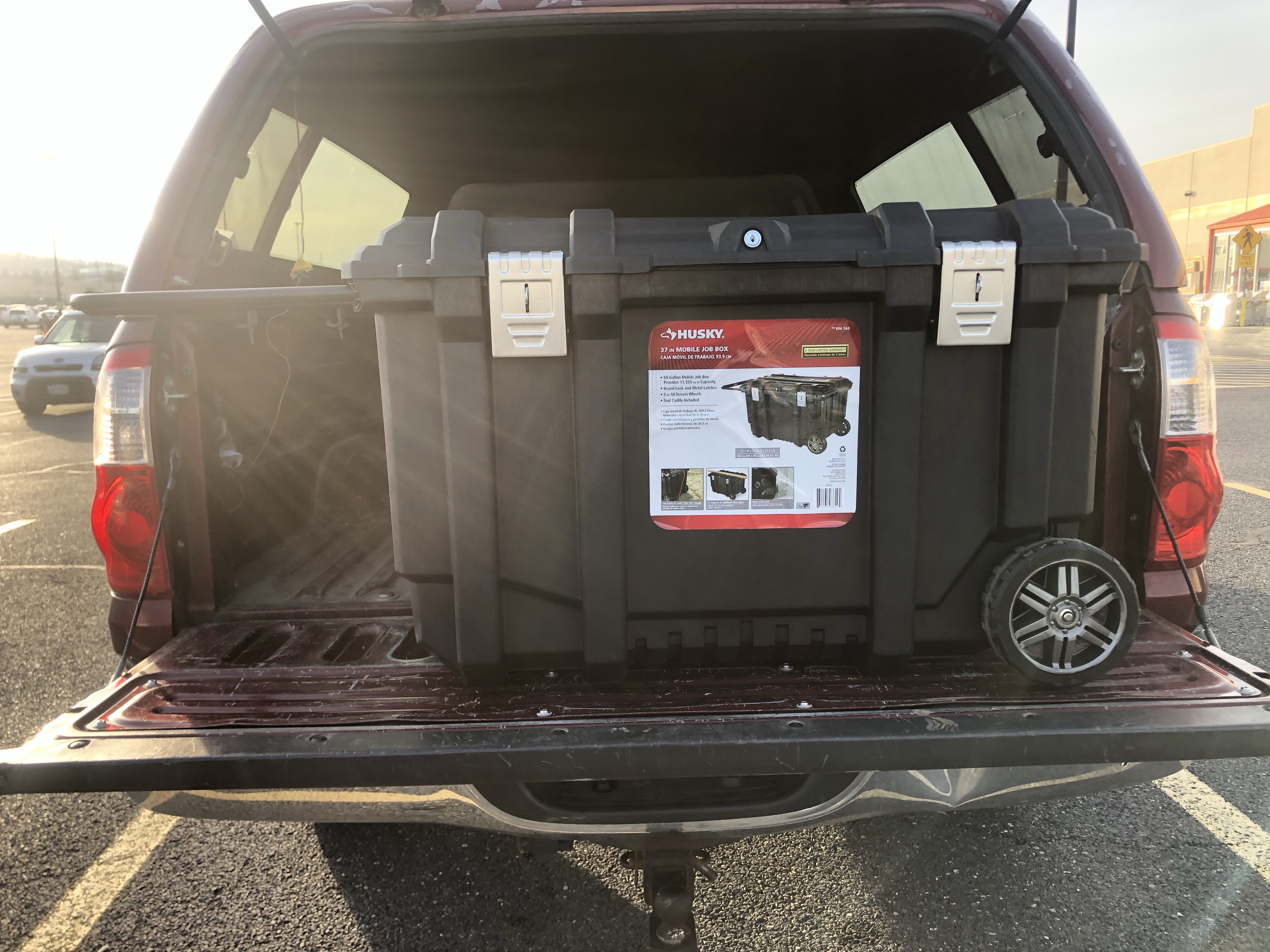 My previous tote was a plastic foot locker, with wheels on one end. Wheels are key. And although it was sold as water tight, even from the start it would take on water. It also was not large enough to fit the stack of stepping stones (a new set of 6), the association containers, four flag holder, bucket, toolbox, and such.