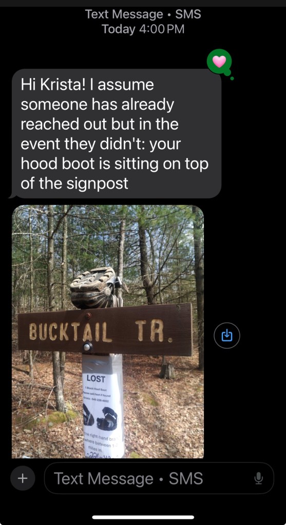 On the ride back to my trailer I noticed a missing hoof boot. I rode back and forth over the 2 mile stretch it was likely lost in to no avail. And with the shadows getting long I called it.