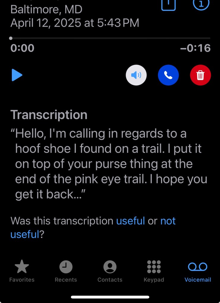 A week or two later, while at MA1, I received a voice mail that someone had found it and left it on the post for me! I was so excited and really happy with humanity.