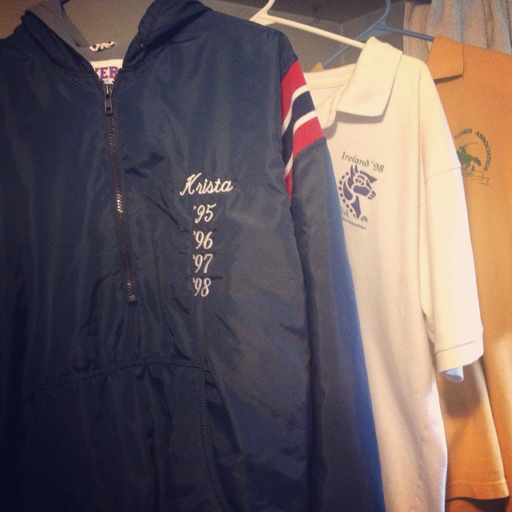 While packing my sewing room I ran across my old USMGA (United States Mounted Games Association) team jacket. I wish it still fit! But it was a little on the tight side when I got it nearly 20 years ago. I also found a white polo shirt from World Team Championships in Ireland in 98′ and an Irish MGA polo shirt. Very cool.