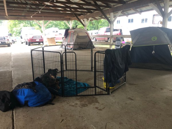 The judges told us that this was a challenging obstacle and no one had done it perfectly yet. King was not cool with it initially, but after we both had our go Jenny showed it to him and he marched on through it perfectly. Simon was huffing at it before we were even near it. He pawed at it and eventually marched on through it.