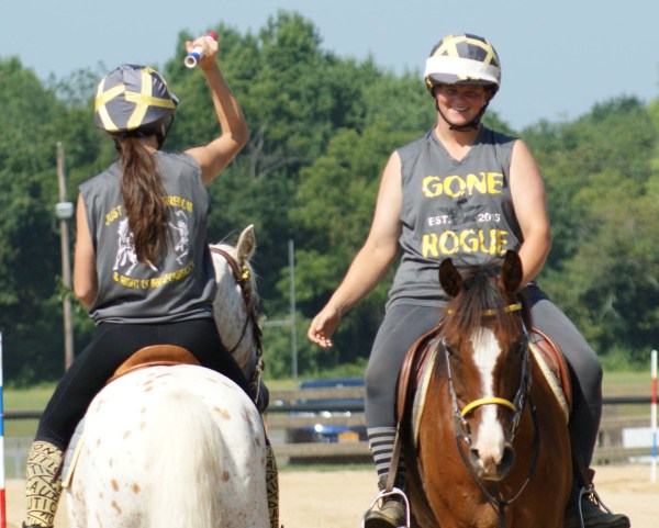 Obstacle 10: ride to the cone and dismount. Lead your pony to the table, and stamp the paper. Return to the cone and remount using the block or from the ground.