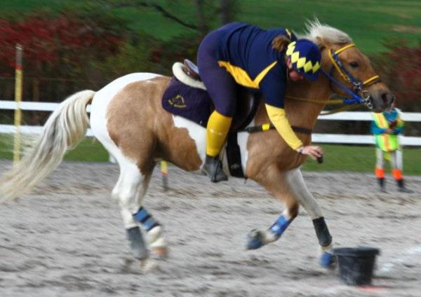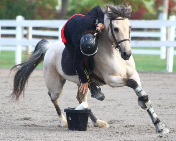 Masters rider dropping her carton off in the bucket. I love this photo, and I think the pony is pretty cool too.