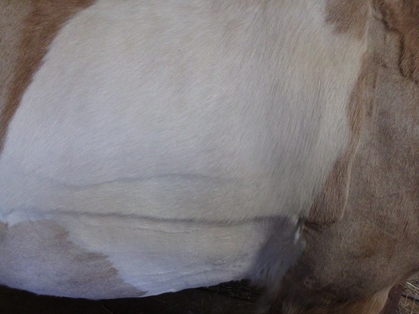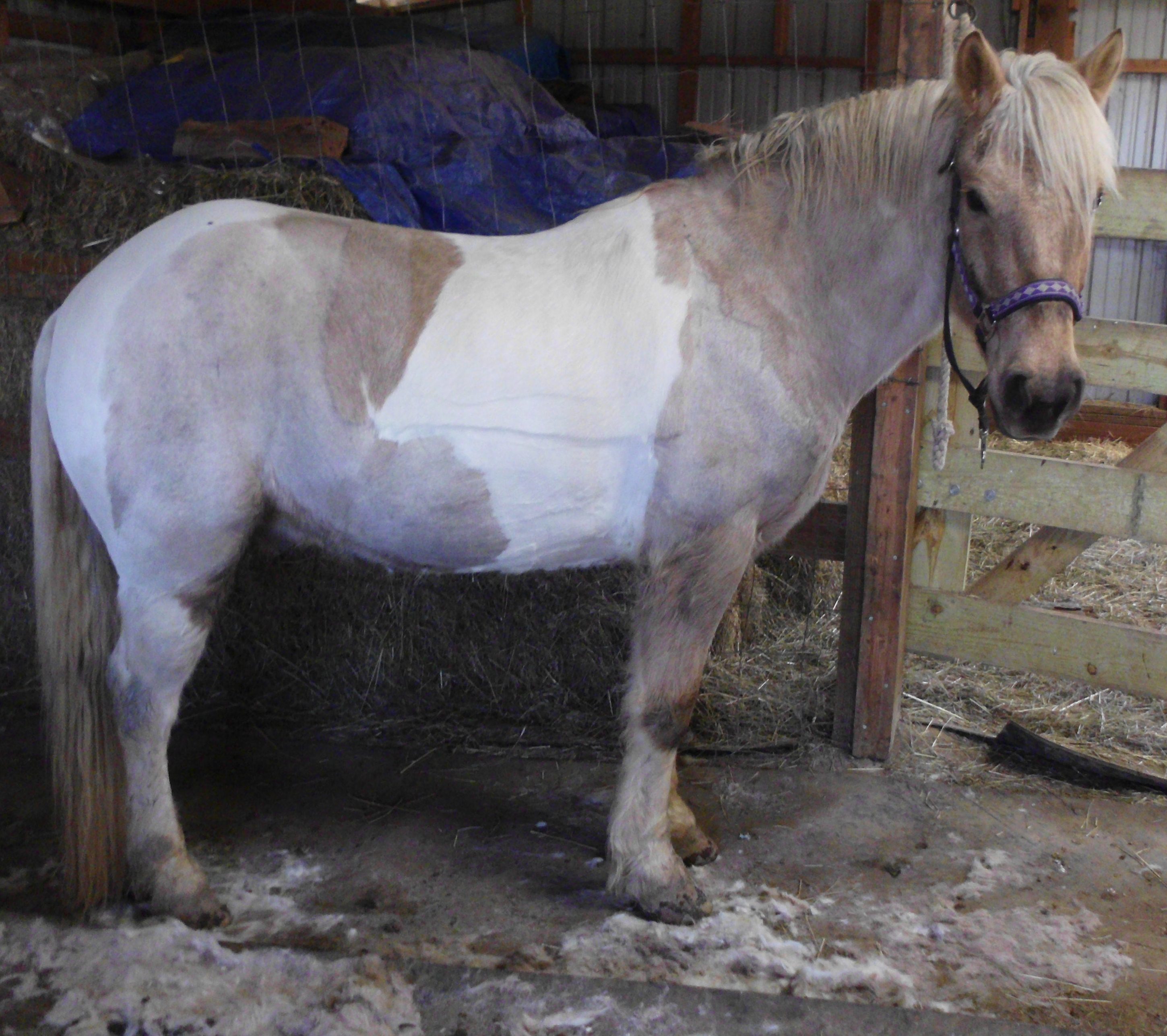 To remedy this, I leave a saddle patch when I clip him now. I put a saddle pad on his back, and then I draw a line around it using a sharpie or a washable marker. Then when I clip him, I clip the line off, but leave everything insideof the line untouched. It solves the problem perfectly. I also don’t usually bother to clip his legs or the majority of his face.