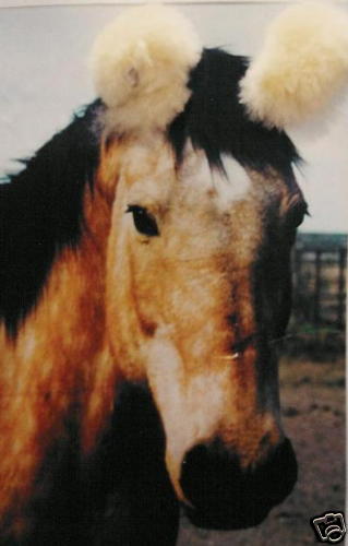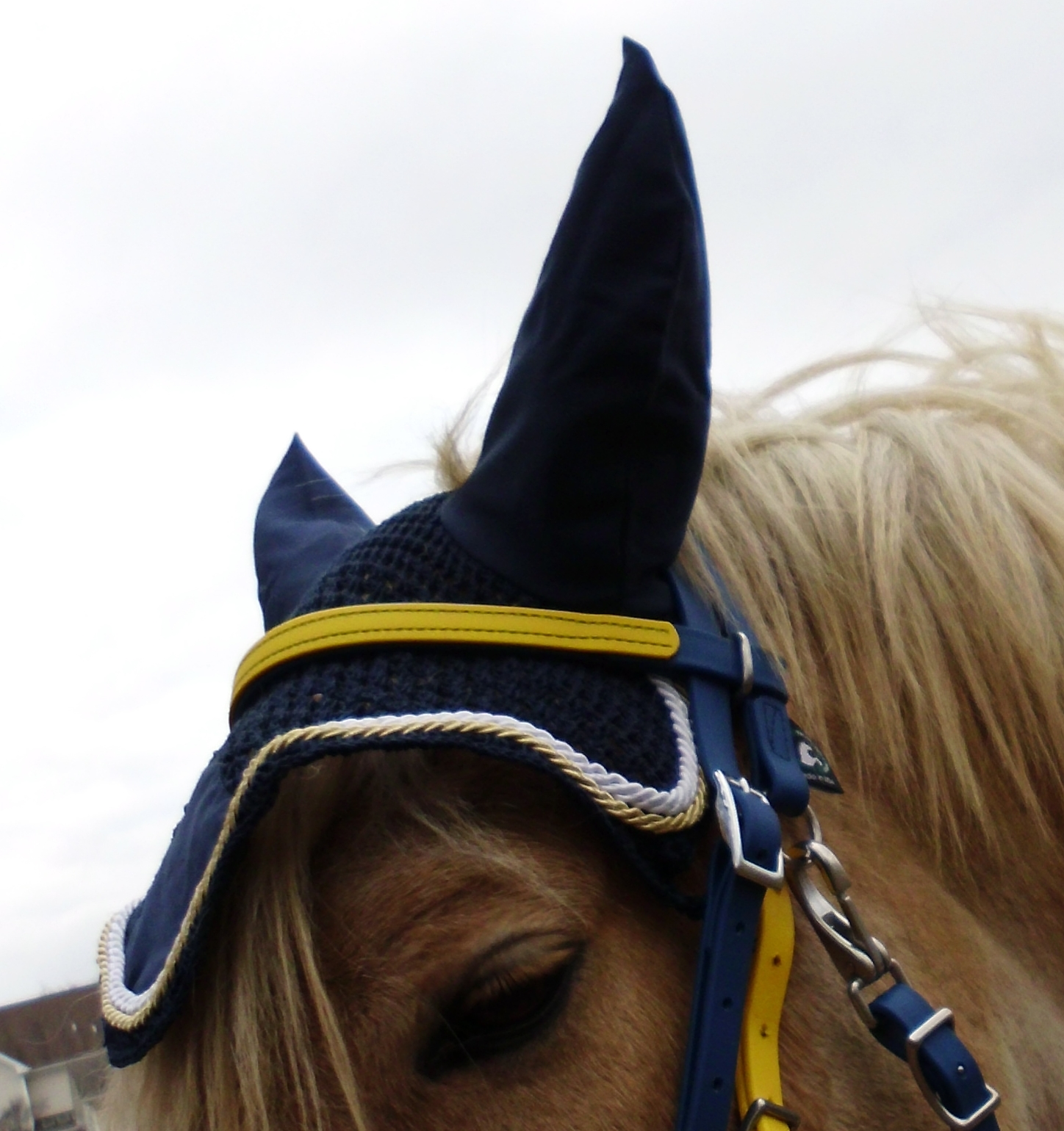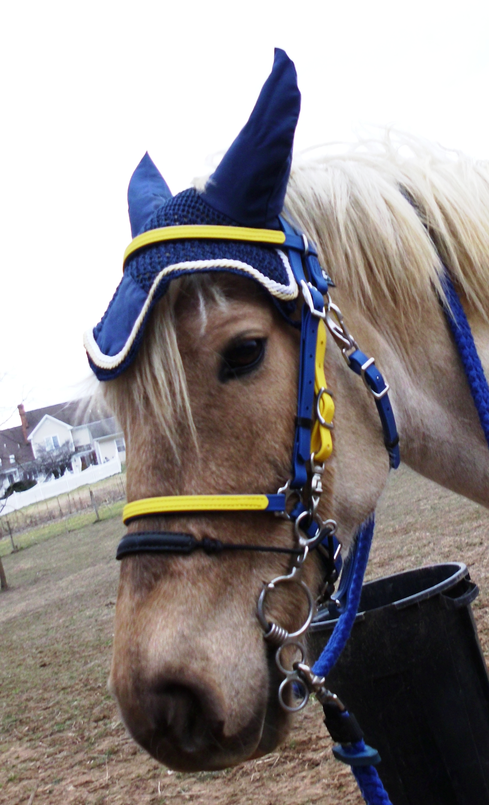 I had a very fuzzy memory of a ear bonnet mixed into my horse stuff so I spent some time digging around until I came up with it.  So I gave that a try last night.  Simon was fine with me putting it on, but kept twitching his ears in attempts to dislodge it so I decided to put it under his bridle instead of over it.     I now understand why people put them on top, as getting his bridle on was a little less than easy, but once it was all straight and in place he seemed less annoyed with it.