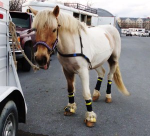 Kelly bathed, fed and let Simon in and out of his stall for the weekend and he was in pristine order when I arrived to pick him up Saturday morning. I had my wash bucket in hand and found him still squeaky clean. Since I had some time to burn I lunged him for a bit to get out some bucks and then got his wraps on in advance, before loading up and shoving off for PA.
