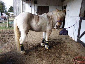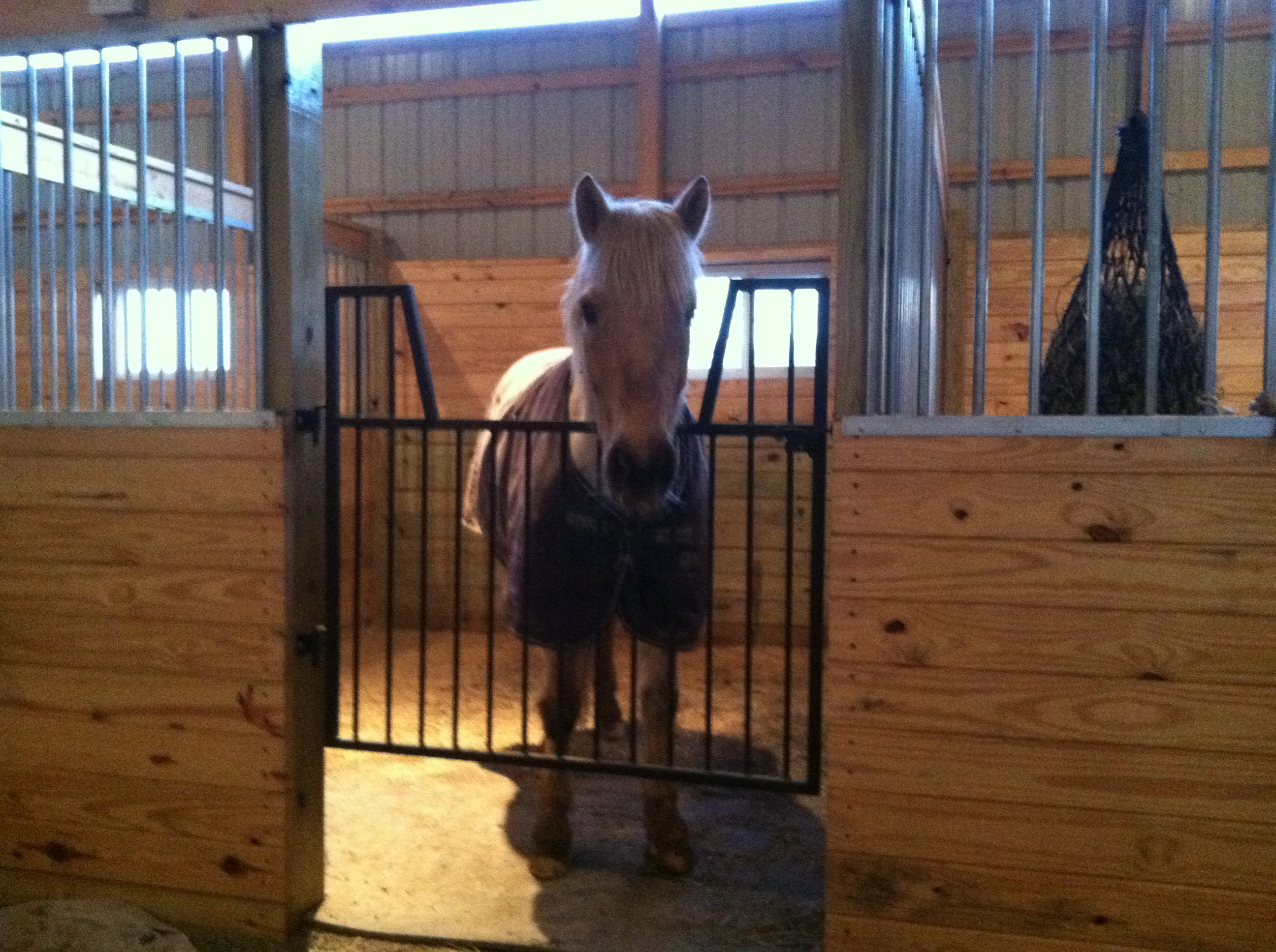 Simon loves stalls, and would prefer to be stabled part of the time versus a full time pasture pony. So he loved having his very own stall for a few days, although he did follow their pony, Nicky’s example and let himself out Thursday night to frolic around.