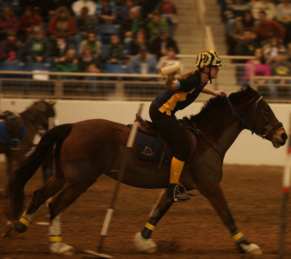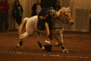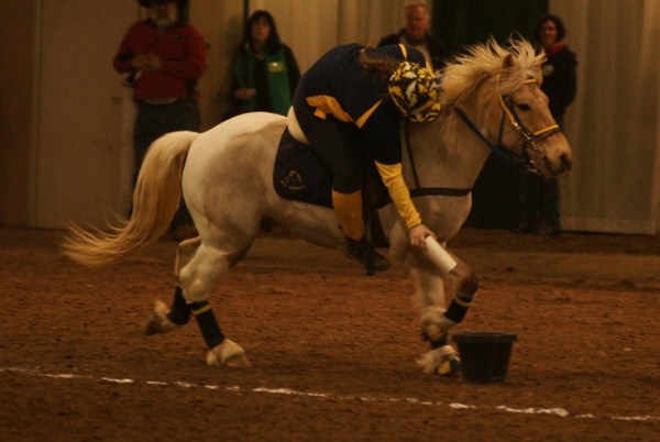 When it was time to go, Linda led the entrance with me and Simon just behind her. Linda’s pony Blue did not hesitate as we reached the opening to the arena and we pranced into a packed house. The other riders all followed and everyone lapped the arena a few times for warm up as our fantastic ring crew prepared the equipment, and a few short minutes later, we were ready to roll.