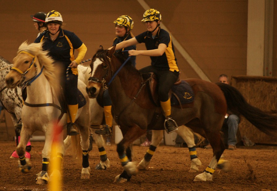 Before long it was time to tack up and get dressed in our navy and yellow gear. Linda, Kim and I combined our team, Old School, with two riders, Nancy and Phyllis, from the pink and black team, Time Flies. Together we were representing the adult, “fossil” division. Once tacked up, we spent a bit of time trying to figure out how to get into the venue with our ponies. This was surprisingly difficult as the venue did not have signage or people out to offer direction. We eventially found a people door we were suppose to take our ponies through and then made our way to the holding area.