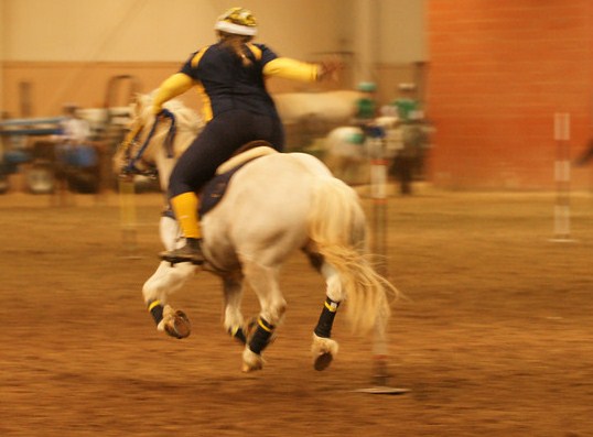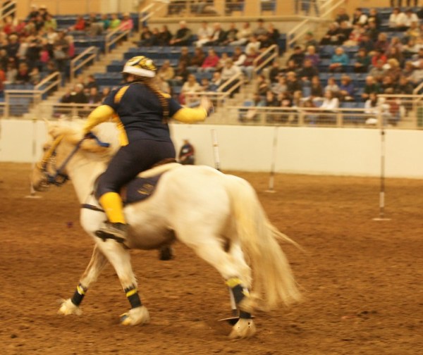 The other crowd favorite was Mackenzie on her leopard Appaloosa Inky. Mack and Inky are amazingly fast, and work together like a clock work team, with Mack vaulting on and off, and performing all of her skills at a full gallop. The striking appearance of Inky certainly caught spectators’ eyes and after the event I repeatedly heard interested individuals asking about the “Dalmatian pony”.
