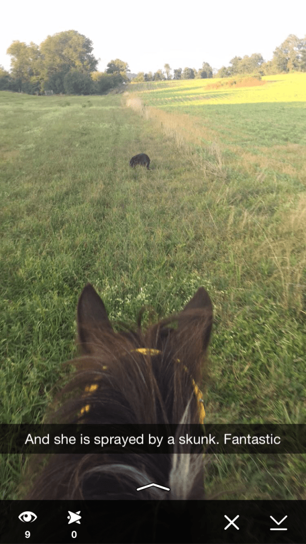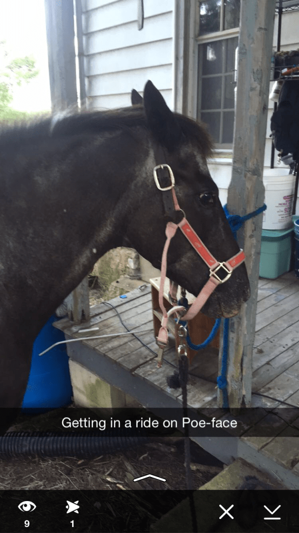 I got home and got the packing under way. Feeling good about my progress I decided I had time to get a short ride in on both ponies. I had not been able to get in a ride the past few days and the ponies we’re excited for attention. I tacked up Poe first and headed out for a leisurely hack around the farm. About ten minutes in Daisy came racing across a hay field to catch up. As she got closer I noticed she was running funny, ducking her head to the ground, dragging her face… Uh oh.